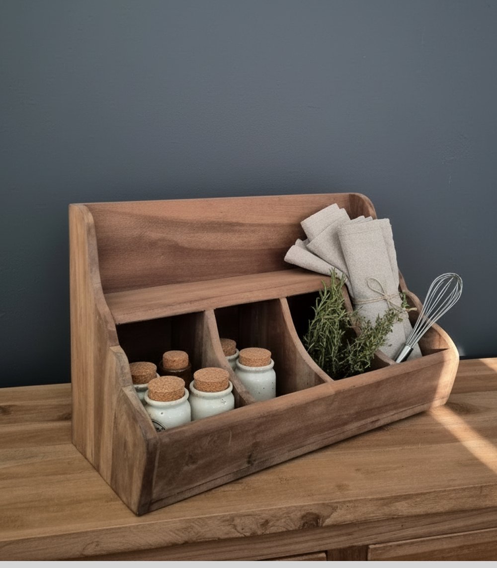 Deze houten gruttersbak gemaakt van teakhout combineert functionaliteit met een natuurlijke uitstraling. Dankzij de verschillende compartimenten berg je kruiden, potjes en keukenaccessoires overzichtelijk op. Het robuuste hout en de zachte rondingen geven de bak een warme, ambachtelijke look. Ideaal voor gebruik in de keuken, maar ook mooi in de bijkeuken of op tafel als organizer.