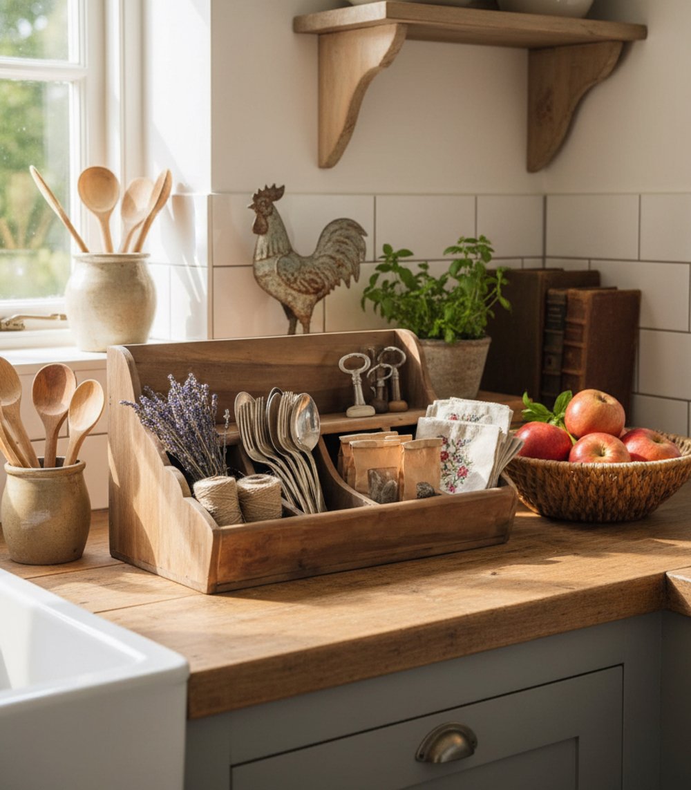 • Küchenutensilien: Verstauen Sie Küchenutensilien wie Löffel, Pfannenwender und Pinsel in den Fächern, damit Sie sie beim Kochen schnell griffbereit haben. Das ist nicht nur praktisch, sondern verleiht Ihrer Küche auch einen rustikalen Charme.