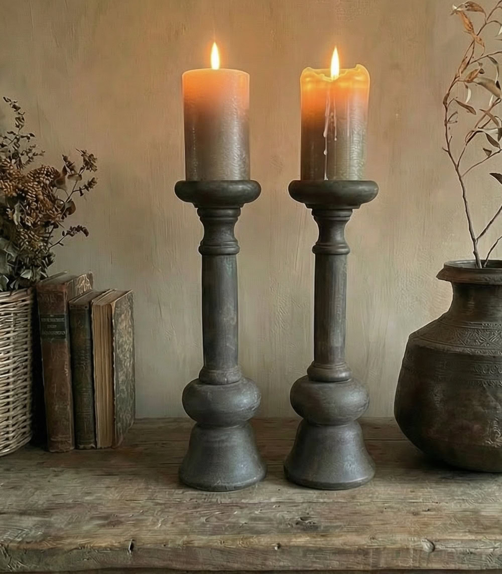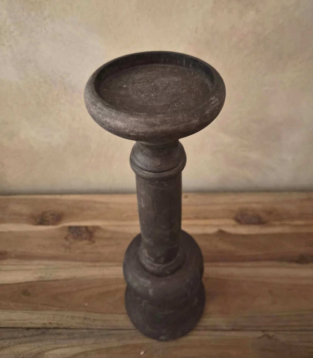 Diese hölzernen Kerzenständer verleihen Ihrem Interieur sofort Charakter. Die dunkelbraune, leicht gealterte Oberfläche sorgt für eine warme und ruhige Atmosphäre, die perfekt zu einem ländlichen oder minimalistischen Wohnstil passt. Die dezenten Unregelmäßigkeiten und die natürliche Maserung des Holzes machen jeden Kerzenständer zu einem Unikat. Platzieren Sie sie auf einem Tisch, einem Sideboard oder auf der Fensterbank. Sie lassen sich mühelos mit anderen Wohnaccessoires kombinieren und fügen sich gleichermaßen gut in ein ländliches oder industrielles Ambiente ein.