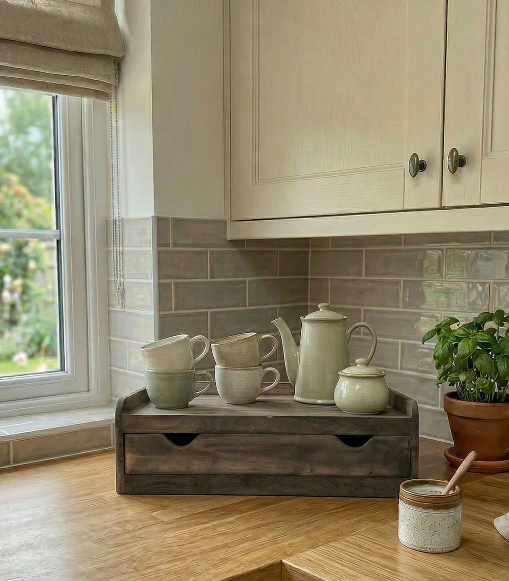 Prachtige houten plateau met lade. Een veelzijdige item die je op verschillende manieren kunt gebruiken, zowel functioneel als decoratief. Mooi en handig voor in bijvoorbeeld de keuken voor je koffie en thee accessoires.
