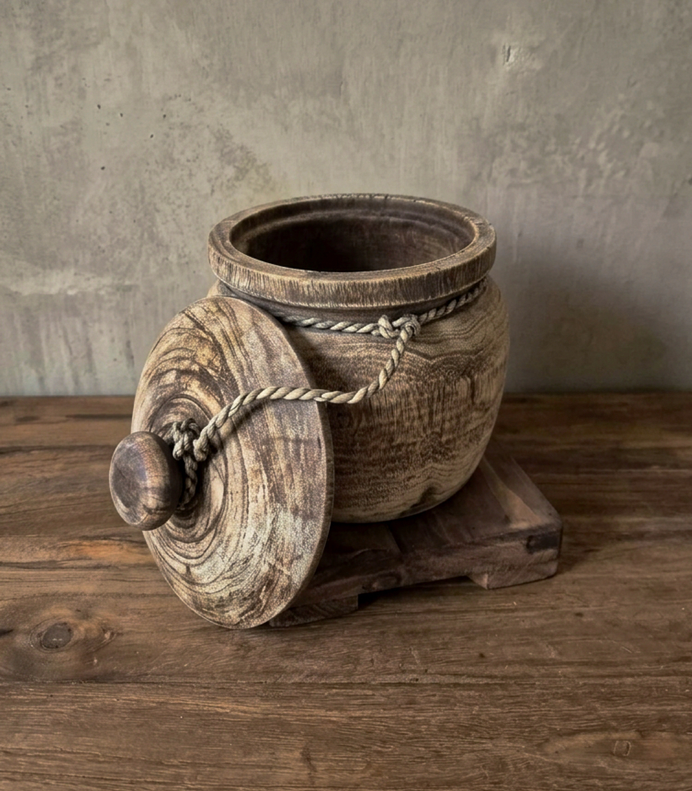 Ein schöner Holztopf mit Deckel im Landhausstil kann eine reizende Ergänzung für Ihre Inneneinrichtung sein. Diese Töpfe zeichnen sich oft durch ihr rustikales Aussehen und ihre handwerkliche Verarbeitung aus und passen daher perfekt in ein ländlich oder traditionell eingerichtetes Zimmer.