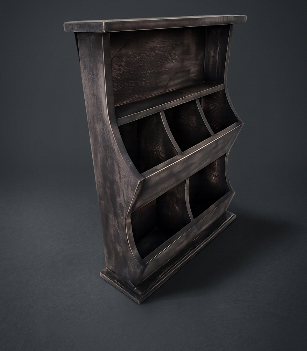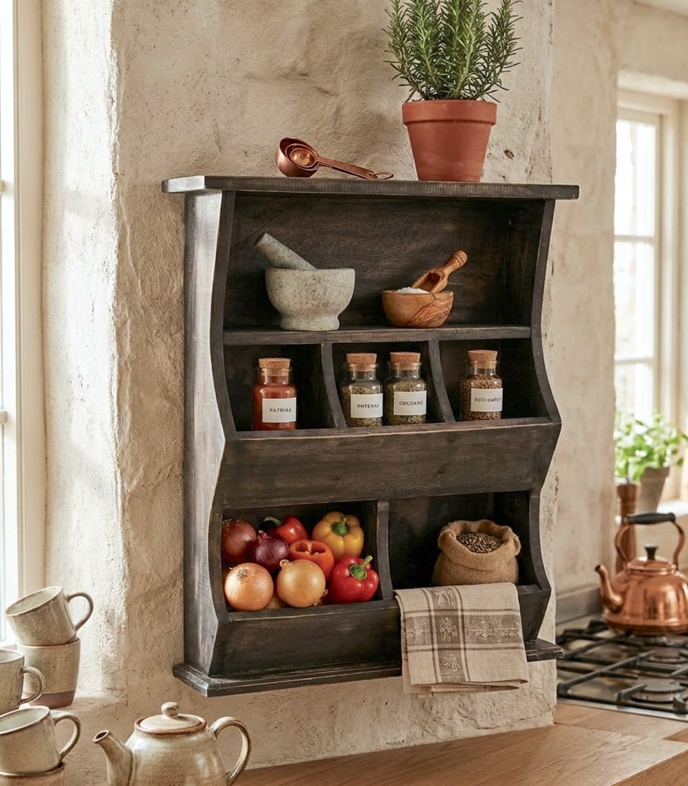Das Regal ist vielseitig einsetzbar: Es lässt sich problemlos an der Wand befestigen, aber auch auf einer Arbeitsplatte, einem Regal oder einem Sideboard platzieren. Die graue Waschung und die robuste Optik machen es zur perfekten Ergänzung für Küchen im Landhausstil oder im minimalistischen Stil.