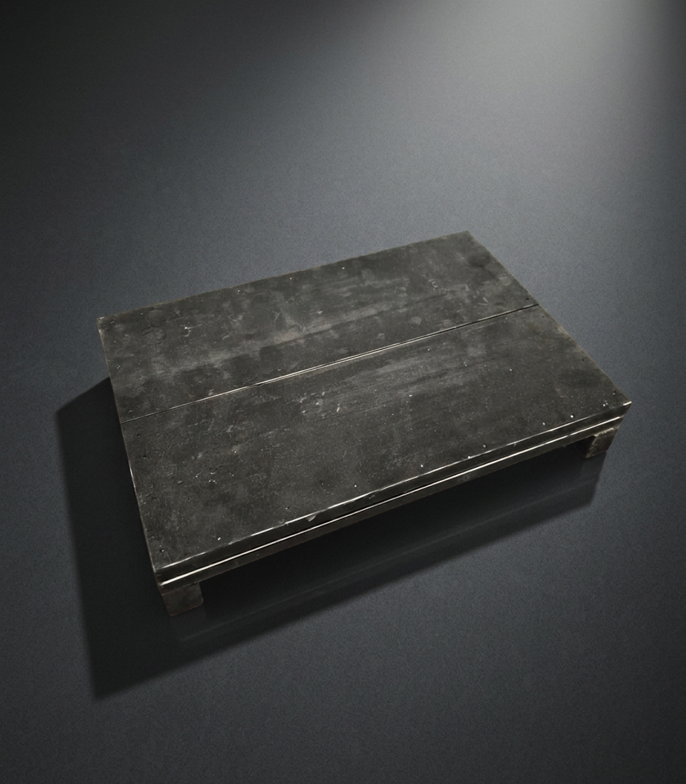Das Plateau wurde mit zwei Anstrichen unterschiedlicher Kreidefarben versehen, wodurch ein authentischer, gealterter Look entsteht. Helle Stellen und geschliffene Bereiche sind in der schwarzen Kreidefarbe bewusst sichtbar, was den charakteristischen Vintage-Effekt erzeugt.