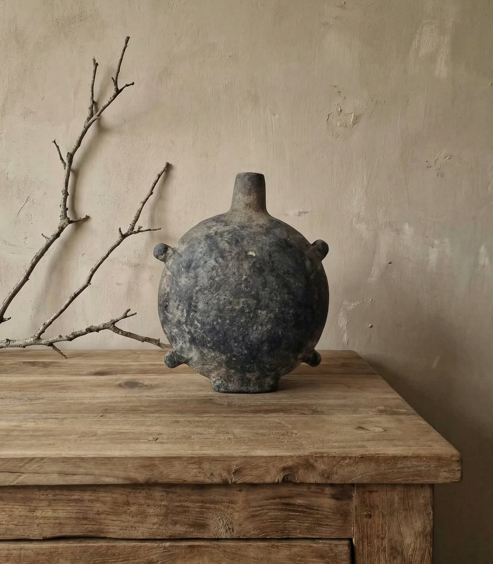 Deze authentieke handgemaakte kruik is een prachtig karaktervol decoratiestuk. De bolle vorm, ruwe kleistructuur en subtiele handgevormde noppen geven deze pot een unieke, doorleefde uitstraling.