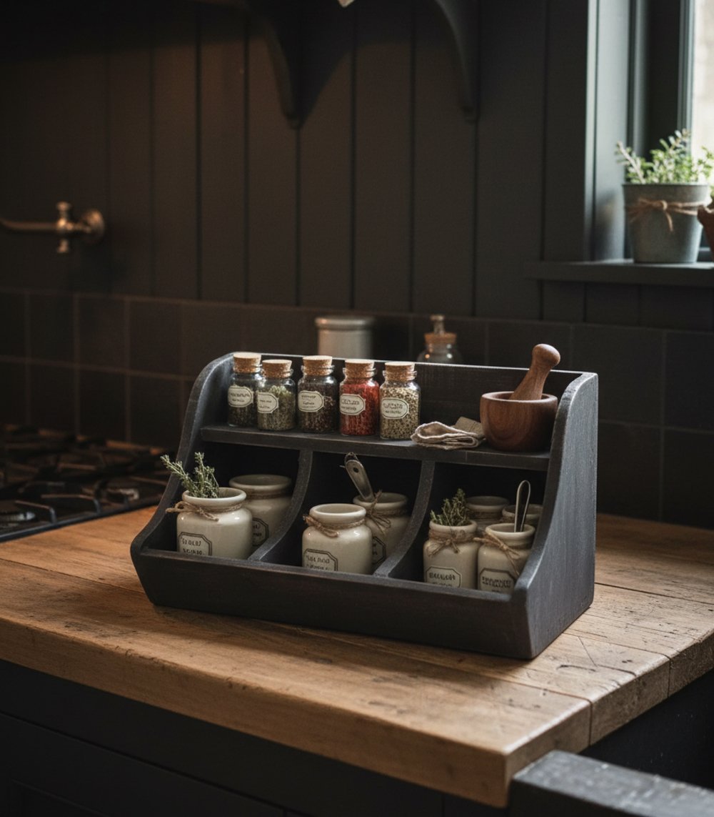 Keukenbenodigdheden: Plaats keukengerei zoals lepels, spatels en kwasten in de vakken voor gemakkelijke toegang tijdens het koken. Dit is niet alleen praktisch, maar het voegt ook een rustieke charme toe aan je keuken.