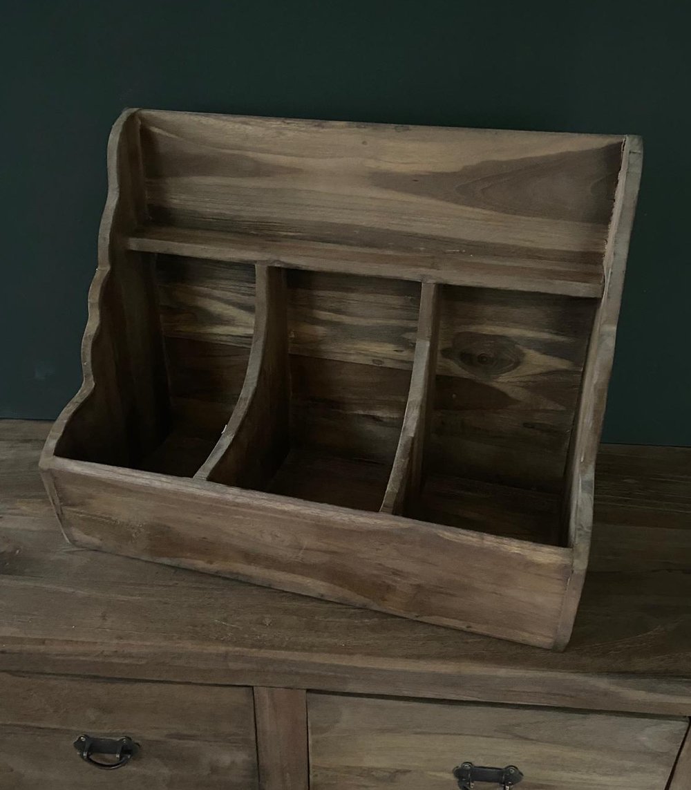 Keukenbenodigdheden: Plaats keukengerei zoals lepels, spatels en kwasten in de vakken voor gemakkelijke toegang tijdens het koken. Dit is niet alleen praktisch, maar het voegt ook een rustieke charme toe aan je keuken.