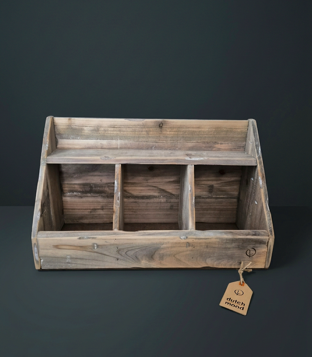 Deze houten gruttersbak gemaakt van hout combineert functionaliteit met een natuurlijke uitstraling. Dankzij de verschillende compartimenten berg je kruiden, potjes en keukenaccessoires overzichtelijk op. Het robuuste hout en de zachte rondingen geven de bak een warme, ambachtelijke look. Ideaal voor gebruik in de keuken, maar ook mooi in de bijkeuken of op tafel als organizer.