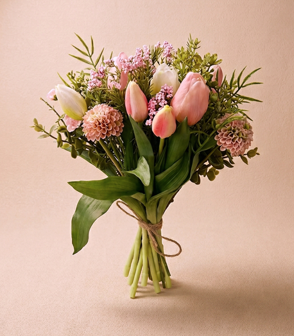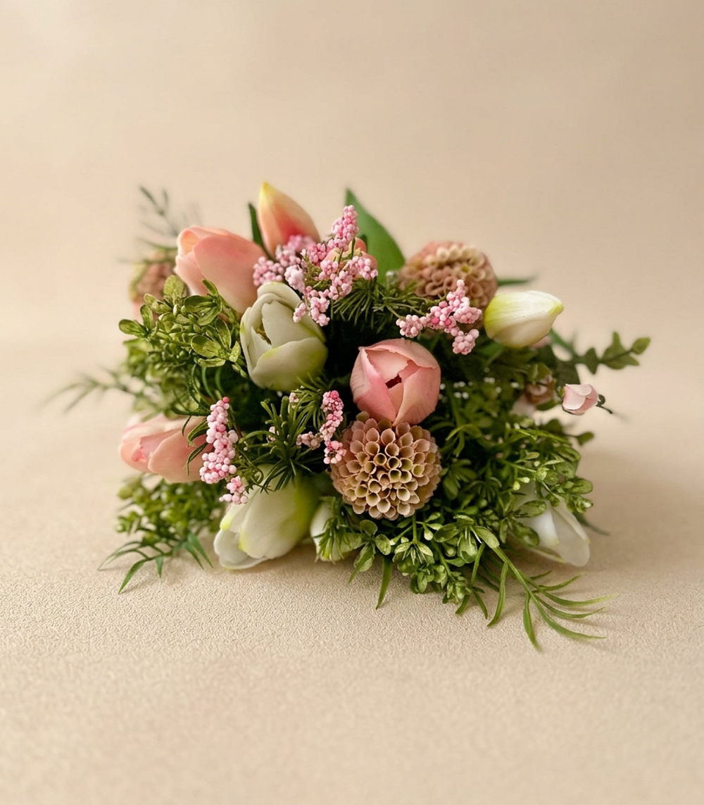 Dit gemengde boeket kunstbloemen met tulpen brengt direct sfeer in huis. De bloemen zijn zorgvuldig door ons uitgekozen en samengesteld en hebben een zachte, natuurlijke uitstraling, waardoor ze bijna niet van echt te onderscheiden zijn. De tulpen geven het boeket een frisse en elegante touch, mooi in balans met de andere bloemen.
