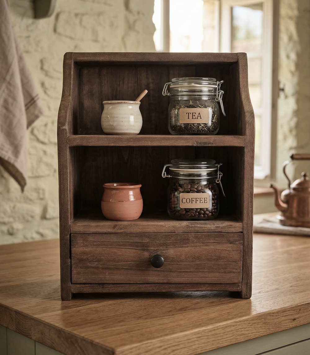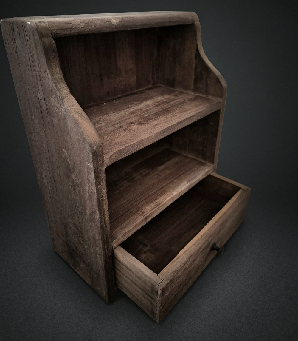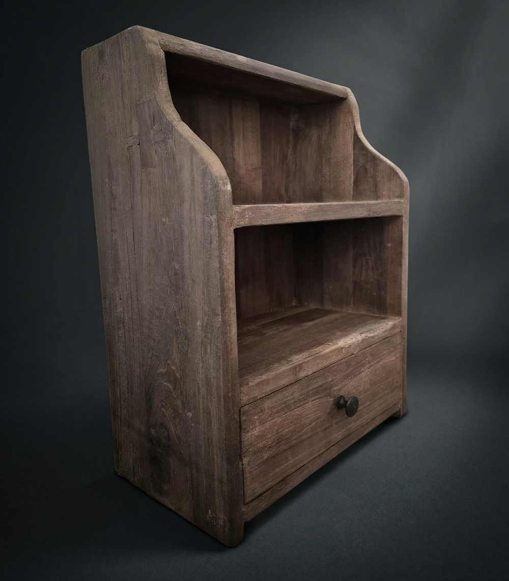 Houten opbergkastje met lade gemaakt van teakhout. Het compacte houten kastje beschikt over twee open vakken en een handige lade, waardoor je eenvoudig kleine spullen kunt opbergen en tegelijkertijd een mooie plek hebt voor decoratie.