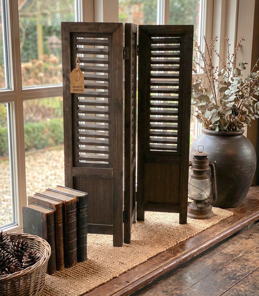 Prachtige decoratieve raam shutter bestaande uit 3 luiken. Deze raam shutter is met de hand vervaardigd en perfect te gebruiken als decoratie op de vensterbank, dressoir of sidetable. Een mooie toevoeging aan je interieur die direct sfeer brengt in je woonkamer.