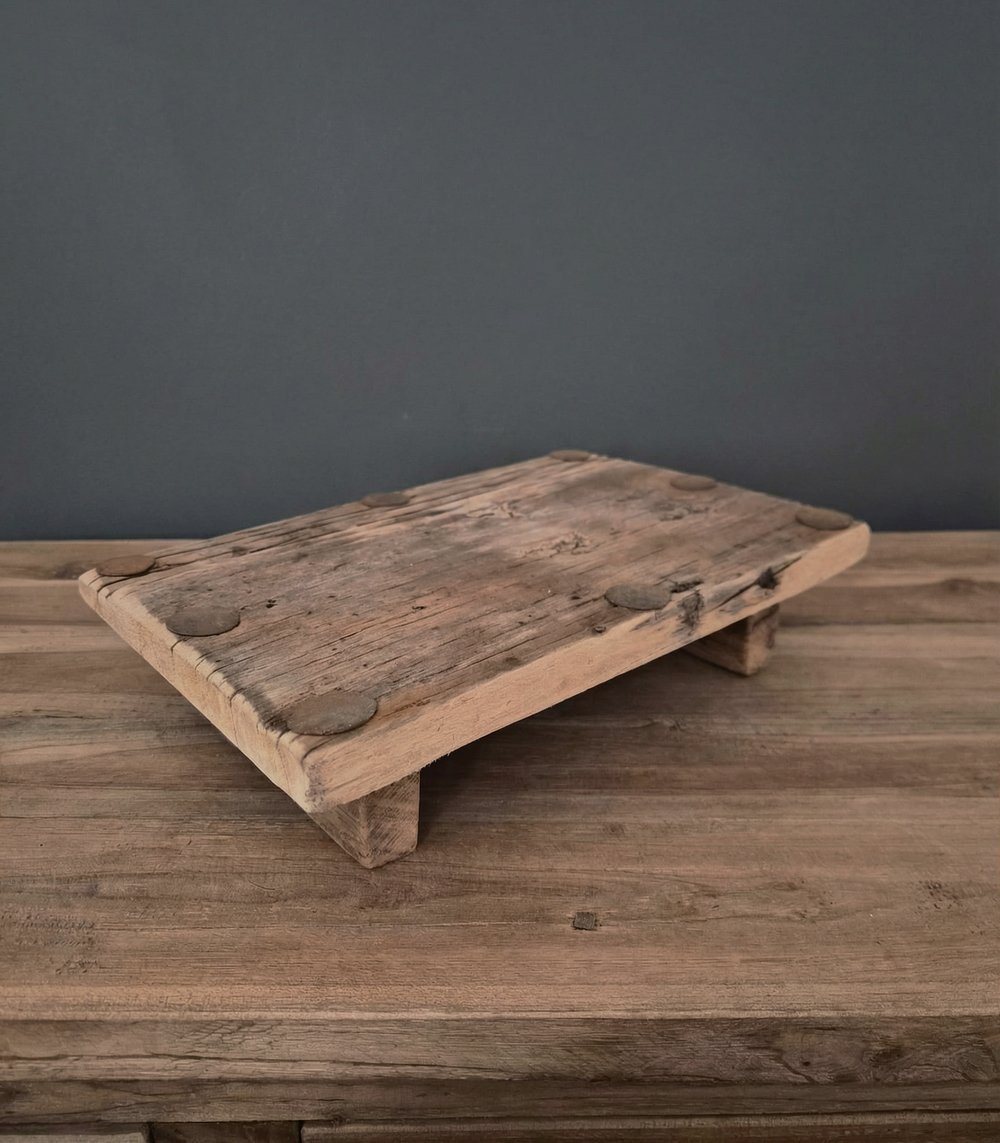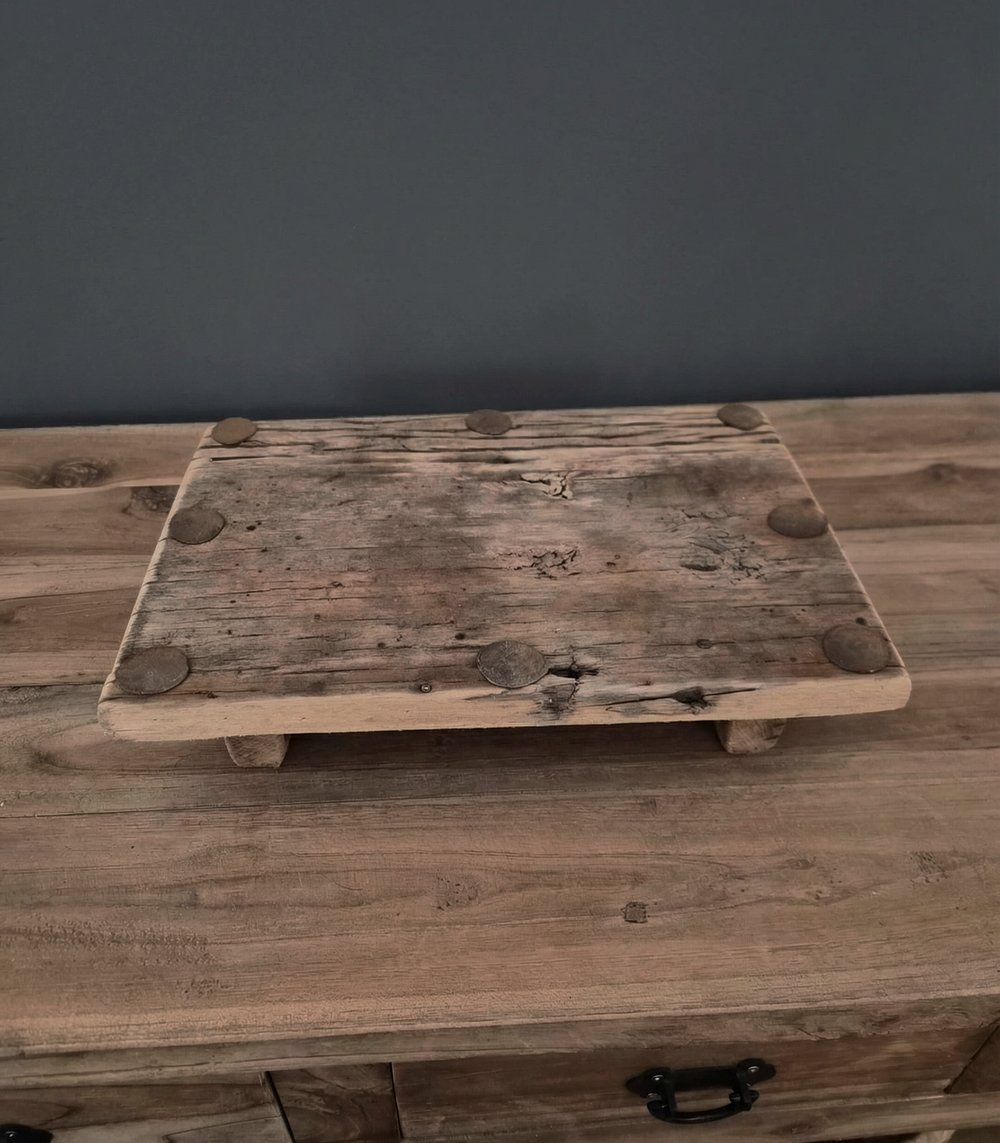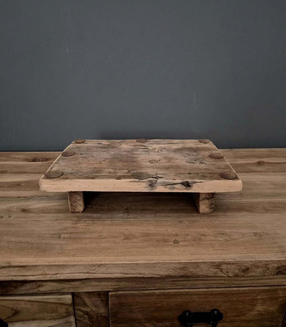 Dit prachtige robuuste vensterbank tafeltje/plateau is gemaakt van authentiek railway wood afkomstig uit India en straalt pure karakter en warmte uit. De doorleefde houtstructuur en originele details maken elk exemplaar uniek. Perfect om decoratie, kaarsen of planten subtiel te verhogen op de vensterbank, dressoir of tafel.